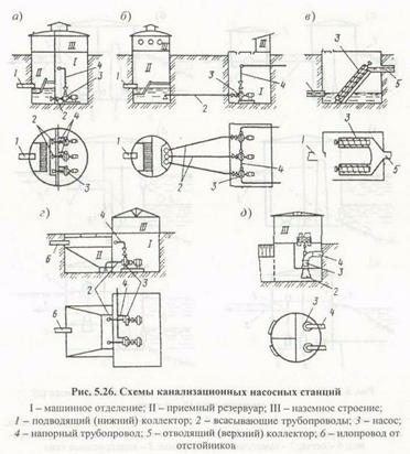 Тип насосной станции водоотведения диктуется главным образом глубиной заложения подводящего коллектора, объемом сточных вод и регулярностью их поступления, гидрогеологическими условиями (в частности наличием грунтовых вод, типом установленных насосов и двигателей (рис. 5.26)).