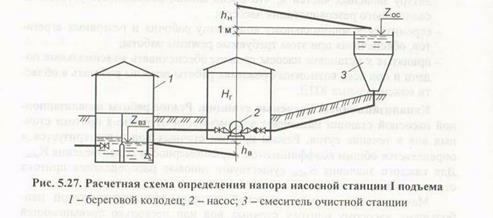 Насосные станции I подъема. Напор, который должны развивать насосы I подъема, рассчитывают для конкретной схемы размещения станции в системе водоснабжения. При подаче воды на очистные сооружения (рис. 5.27) требуемый напор определяется по формуле: