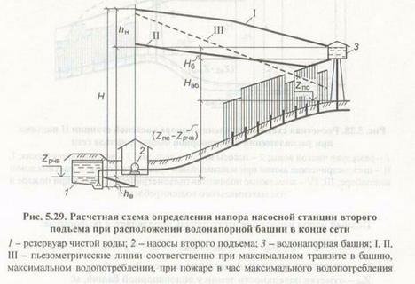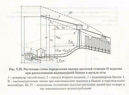На рис. 5.28 показана расчетная схема для определения напора насосной станции Ц подъема при расположении водонапорной башни в начале сети.