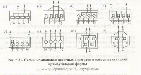 В насосных станциях прямоугольных в плане и незаглубленных и полузаглубленных (насосные станции I подъема раздельного типа и насосные станции II подъема) применяют (рис. 5.31) однорядную (а—е) и двухрядную (ж, з) схемы компоновки насосных агрегатов.