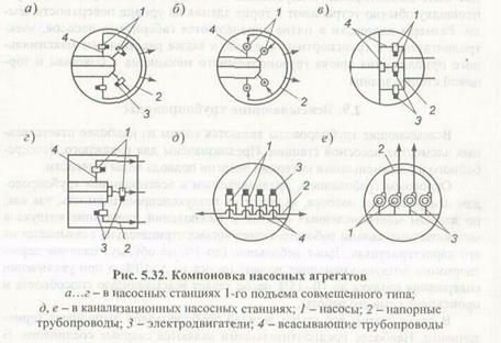 На рис. 5.32 представлены схемы компоновок насосов в насосных станциях круглых в плане и, как правило, заглубленных (насосные станции I подъема совмещенного типа (а—г) и канализационные - схема д, е).