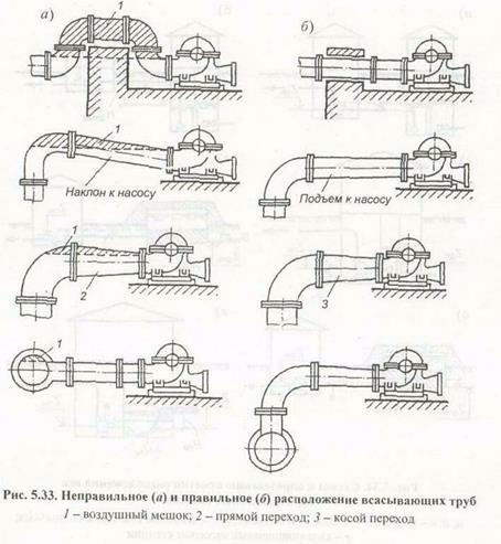 Для предотвращения образования во всасывающем трубопроводе воздушных мешков трубопровод прокладывают с подъемом в сторону насоса (уклон не менее 0,005), чтобы воздух, выделившейся из воды в зонах с пониженным давлением, мог свободно двигаться вместе с водой к насосу. По этой же причине при переходе с одного диаметра на другой на горизонтальных участках трубопровода применяют только «косые» переходы с горизонтальной верхней образующей. На рис. 5.33 показаны примеры неправильного и правильного расположения всасывающего трубопровода и присоединения его к насосу.