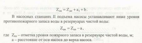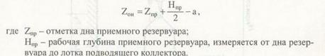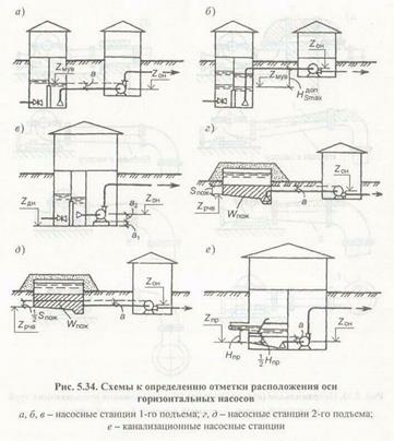 В канализационных насосных станциях отметку оси насоса определяют из условия размещения корпуса насоса под средним уровнем воды в приемном резервуаре (рис. 5.34е):