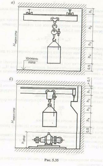Если при транспортировании груза на монтажную площадку его необходимо проносить над установленным оборудованием (рис. 5.35 б), то в формулу вводится дополнительно высота этого оборудования hcб,.