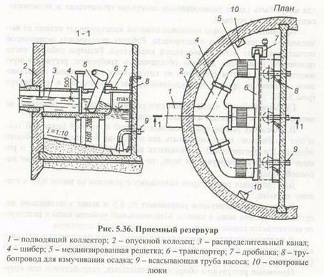 В помещении приемного резервуара насосной станции сточная жидкость освобождается от части загрязнений с помощью решеток, устанавливаемых в подводящем канале. Вместимость приемного резервуара выбирается по требованиям СНиП (минимальная вместимость приемного резервуара должна быть не менее 5 мин подачи самого крупного из установленных насосов) по графику притока и откачки сточной жидкости и по конструктивным соображениям размещения насосного оборудования, безопасности и удобства его обслуживания. Малая вместимость приемного резервуара уменьшает строительные объемы насосной станции, предотвращает выпадение осадка и его загнивания. Большая вместимость резервуара неприемлема вследствие того, что поступающие сточные воды содержат значительное количество загрязнений, которые, осаждаясь в резервуарах, будут загнивать. Оптимальную вместимость приемного резервуара определяют на основании технико-экономических расчетов для каждого конкретного случая, где могут быть самые разнообразные сочетания технических и экономических факторов и условий. Приемные резервуары насосных станций конструируют исходя из вычисленной и принятой их вместимости. Рабочая вместимость резервуаров отсчитывается от лоткаподводящего коллектора. Размеры рабочей части приемного резервуара должны обеспечивать требуемую регулирующую вместимость с учетом стеснения ее конструкции резервуаров, всасывающим линиям и другим оборудованием, расположенным в резервуаре (рис. 5.35).Глубину рабочей части приемного резервуара следует принимать не менее 1,5-2,0 м для малых и средних станций и 2,5 м в более крупных. В приемных резервуарах насосных станций с подачей более 100 тыс. м3 /сут необходимо предусматривать два отделения без увеличения общего объема. Это обеспечивает возможность выполнять осмотр, очистку и ремонт приемного резервуара на ходу, то есть без полного отключения насосной станции. Дно приемных резервуаров выполняют с уклоном не менее 0,01 в сторону приямка. Перекрытие резервуаров устраивают на 0,5 м выше максимально допустимого уровня воды в канале. Максимальный уровень воды в резервуаре принимается равным отметке лотка подводящего коллектора.В перекрытии устраивают два смотровых люка для спуска в резервуар. Располагают их у стен резервуара в местах крепления ходовых скоб (лестниц).Приемные резервуары оборудуют решетками, устройствами для взмучивания и смыва осадков, шиберными затворами, аварийными выпусками.Ориентировочно размер (диаметр) насосной станции и вместимость типового приемного резервуара приведены в нижеследующей таблице.
