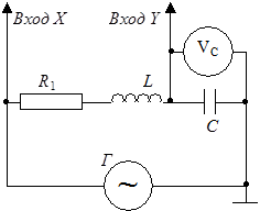 Измерение фазового сдвига между напряжением на выходе генератора и напряжением на конденсаторе проводится с помощью фигур Лиссажу. Для этого напряжения с конденсатора и выхода генератора подаются на входы Y и X осциллографа: