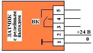 Наиболее простым получается соединение с датчиками, обладающими релейными выходами (рис.1.11). На клеммах 3-4-5 организована контактная группа, гальванически не связанная с остальными компонентами контроллера. Это позволяет подать входной сигнал на ПЛК через эту контактную группу от любого подключенного к ней источника питания.