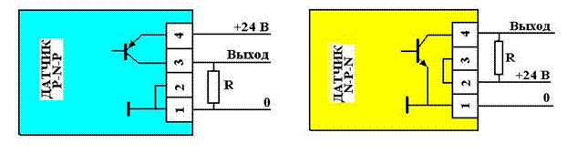 при котором переключение выходного сигнала осуществляется бесконтактно, за счёт применения транзистора в выходном каскаде. Распространены два варианта таких выходов N – P – N и P – N - P при трёхпроводном включении (рис.1.12). Оба варианта построены на каскаде с открытым коллектором, поэтому требуют включения внешнего резистора R. Если иметь в виду подключение датчиков с таким выходом к контроллеру, нужно помнить, что сигнал на вход ПЛК надо подавать плюсом на входную клемму относительно нулевой шины питания. Выполнить это условие можно, если снимать сигнал с R относительно корпуса у датчиков P – N – P типа (рис.1.12,а) или с коллекторно - эмиттерного перехода выходного транзистора у датчиков N – P – N типа (рис.1.12,б). Нетрудно заметить, что включение транзистора в первом случае приводит к выдаче выходного сигнала уровнем ON, тогда как во втором – уровнем OFF. Получаемая взаимная инверсия снимаемого сигнала с датчиков, обладающих различным исполнением выходов, легко учитывается при составлении программы контроллера.