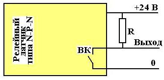 Такого же типа выходные цепи широко используются для находящих широкое применение индуктивных, ёмкостных и других датчиков положения (приближения) [ ]. Их особенность только в том, что вместо транзистора ключевым элементом может использоваться релейный внутренний контакт ВК (рис.1.14). С предыдущим вариантом (рис.1.13) это исполнение выхода объединяют похожесть расположения ключевого элемента и одинаковость способа сопряжения с контроллером, а с вариантом, изображенным на рис.1.12, – только то, что ключ выбран контактным.
