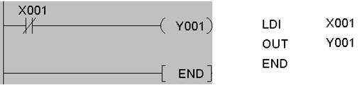 и команда LDI обозначают нормально закрытый (замкнутый) контакт X1, при срабатывании которого выход Y1 перейдёт в состояние OFF (выключено).