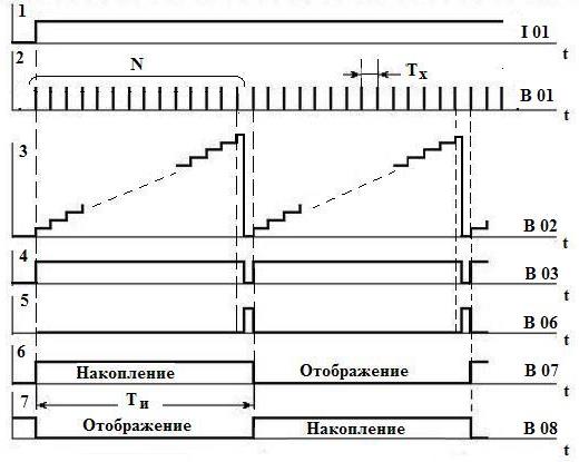 Входным сигналом (диагр.1) программа запускается. Формируемая непрерывная последовательность импульсов (диагр.2) поступает на счётчик (диагр.3). Временные параметры генерируемых импульсов (2) и устанавливаемый коэффициент счёта счётчика должны допускать настраиваемость программы на получение интервала наблюдения 10 секунд.