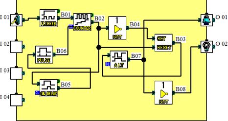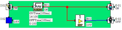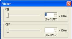 По сравнению с рис.2.11 в полях задания длительностей импульса и паузы блока FLICKER вместо единиц введены коэффициенты 100. После умножения их на 100ms = 0,1s получаются длительности импульса и паузы как раз равными требуемым 10 секундам. В этом варианте экономится объём занимаемой памяти, программа просто выглядит, легко читается.
