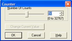 При включении I 01 начинает генерировать импульсы блок FLICKER. В окне описания блока заданы длительности импульса ON и паузы OFF между ними, каждая из которых равна 100ms. При таком задании период равен 200 ms, что соответствует частоте 5 Гц, т.е. получению 5 импульсов в секунду. Чтобы обеспечить общую длительность интервала 10 секунд, в счётчик COUNTER надо ввести коэффициент счёта 50. Все эти вводимые величины показаны на вкладках, представляющих собой фрагменты окон описания блоков FLICKER и COUNTER.