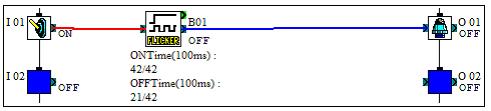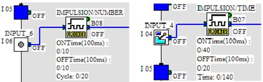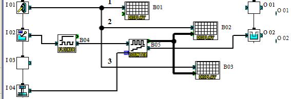 Начальными установками в блоках заданы: непрерывная генерация FLICKER c параметрами: tи =5×100ms, tп =5×100ms; коэффициент счёта блока COUNTER равен 45. Сигнал по входу I 01 управляет подачей разрешения (по линиям 1, 2 и 3) на отображение выводимых параметров. Счётчик после 45 импульсов, поступивших с генератора, переустановит свой выход в ON и включит нагрузку Q 02. Только подача сигнала сброса на вход CL (CLOSE) от дискретного входа I 04 возвращает счётчик B 05 в исходное состояние.