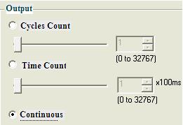 Флажок Continuous (непрерывный, длительный)устанавливают тогда, когда хотят, чтобы генерация происходила постоянно, пока во включенном состоянии будет находиться сигнал I 01. Если в непрерывной работе генератора нет необходимости, то продолжительность его “колебаний” можно ограничить. Для этого предусмотрены две возможности: задать либо число «отрабатываемых» периодов в диапазоне от 0 до 32767 (Cycles Count), либо время генерации (Time Count), равное любому устанавливаемому числу в диапазоне от 0 до 32767 × 100ms. Правила задания режимов генерации для обоих только – что названных случаев поясняются следующими двумя вкладками.
