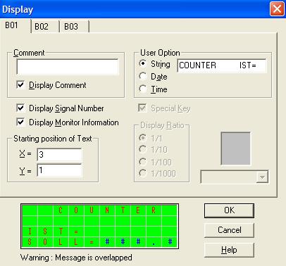 В программе блок B 01 использован для отображения пояснительного текста. Содержание текста вводится в окне User Option при установленном флажке String (строка)и только латинским шрифтом. Текст выберем так, чтобы он содержал название отображаемого блока и указание на текущее значение параметра (IST=) и его разрешённое значение (SOLL=).
