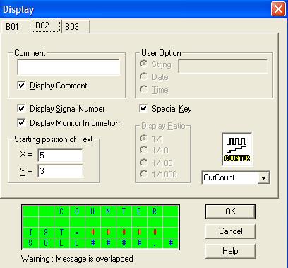 Заслуживает внимания назначение начальных номеров расположения отображаемой информации для блоков B 02 и B03. Блок B 02 запрограммирован на отображение текущего значения счёта Cur Count в третьей строке информационного табло. Средой программирования числовое значение Cur Count предусмотрено отображать пятью десятичными знаками (красный цвет, строка 3).
