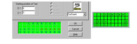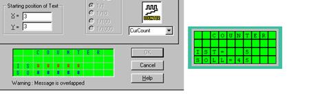 Набранный текст с помощью курсора (он ставится в строке String перед сдвигаемым фрагментом текста) и клавиши ПРОБЕЛ сдвигается на требуемые позиции информационного поля экрана. Начальная позиция расположения текста задаётся номерами столбца (X=3) и строки (Y=1) в поле Starting position of Text. Поскольку отображаемый текст вводится в окно описания блока при его вызове в программу, а не передаётся откуда-то извне, аналоговый вход B 01 не используется.