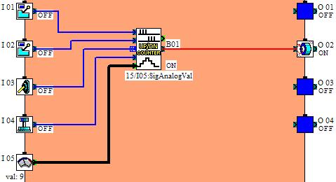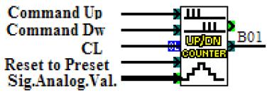 Работа выходов блока. Дискретный выход переключается из OFF (пока насчитано меньше, чем введена уставка) в ON при достижении счёта уставки. Переключение выходной цепи не означает прекращения счёта – он будет продолжаться независимо ни от чего. Если Sig.Analog.Val. введён равным 26, то при достижении числа импульсов, пришедших с входа Command Up, выход блока перейдёт в ON, но счёт может продолжиться дальше (допустим, до 40). Если теперь импульсы пойдут по входу Command Dw, счёт реверсируется, а выход блока возвратится в состояние OFF при значении счёта, равном 25.