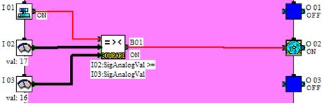 Верхний вход – дискретный. Он может быть разрешающим, если он подключен к источнику сигнала (I 01) и сигнал имеет уровень ON. При отключенном сигнале (уровне OFF) блок перестаёт выполнять сравнение. Если исключить линию подключения входа к источнику I 01, блок будет выполнять все виды сравнения, предусмотренные средой программирования.