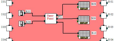 Каждой строке экрана на рис. 3.5 соответствует свой блок DISPLAY: второй строке – B 08, третьей строке – B 09, а четвёртой – B 10. В каждом из блоков текстом введён один и тот же символ: >, но координаты расположения его для каждого блока будут несколько отличаться: X = 5, Y = 2 для B 08; X = 5, Y = 3 для B 09; X = 5, Y = 4 для B 10. Остаётся теперь добиться, чтобы при каждом нажатии кнопки K05 активное (ON) состояние выходных линий F01 переключалось с B 08 на B 09, с B 09 на B10, с B 10 на B 08 и так далее по циклу. Переключающиеся линии будут «подсвечивать» стрелочный указатель на второй, третьей, четвёртой строках, создавая видимость его циклического перемещения. Если нажимать не K05, а K06, направление перемещения указателя должно измениться на обратное. Отмеченное переключение линий с одного блока DISPLAY на другой должна обеспечить некая структура, которая на рис. 3.5 обозначена как функция пользователя User Func. Как должна быть организована эта функция, чтобы соответствовать своему назначению? К выяснению того, что может собой представлять эта функция пользователя, сейчас как раз самое время перейти.