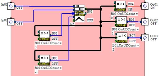 При встречном управлении (K05 и Ip01), когда накопленное значение счётчика, изменяясь от 0, достигнет значения 3, компаратор B 02 сработает и по входу CL сбросит счётчик в нуль.