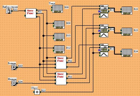 Блоками, формирующими уставки, использованы реверсивные счётчики B 13 ÷ B 15, по одному на каждую из трёх строк. В них заносятся начальные значения уставок (те самые значения 100, 200 и 300, которые упоминались раньше), и в которые блоки переводятся активным сигналом с кнопки B 25 – сигналом сброса в предустановленное значение.