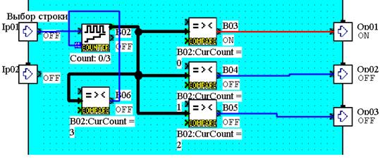 Управление поочерёдной индикацией трёх строк потребует трёх разрешающих сигналов, переключающихся «по кругу»: B08 –B 09 – B10 – B 08 - …. Для обеспечения этого можно использовать счётчик со счётом на 3 и сбросом в исходное состояние. При использовании нереверсивного счётчика (COUNTER) проще всего получить указатель, “бегающий” в одну сторону. У него сброс в 0, поэтому достаточно обеспечить порядок переключения: 0 – 1 – 2 - (если 3, то сброс в 0) – 1 - ….