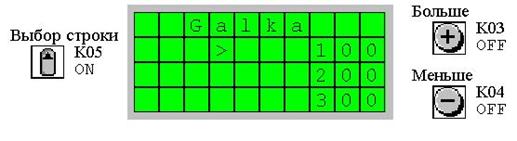 Пример 1 на применение реверсивного счётчика. На экране контроллера, установленного и работающего на объекте, как правило, отображается вся необходимая информация. Часто возникает необходимость внести в неё какие-либо коррективы, поэтому надо обеспечить максимум удобства для этого: пояснительные надписи, перемещаемые указатели, доступ к программе не с компьютера, а с клавиатуры контроллера – т.е. всё то, что облегчает навигацию по информационному полю экрана.