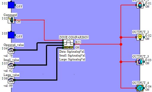 Верхняя граница зоны (Large value) задаётся по самому нижнему аналоговому входу, нижняя граница (Small value) – по второму снизу входу. Анализируемый входной сигнал (Operated value) подаётся на верхний аналоговый вход. Дискретный вход – как обычно, разрешающий.