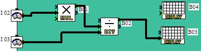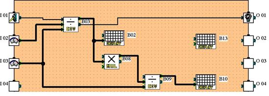 Естественно, что и эту задачу можно решить проще. Для этого изменим последовательность действий и применённые настройки блоков (рис.3.12). В самом начале умножим делимое A в десять раз (если результат надо отразить на экране с точностью до сотой, то умножать надо на 100). Полученное на выходе B 01 произведение