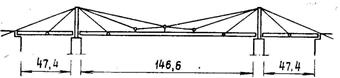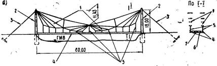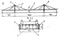 – 1983 г., г. Череповец, мост через р. Шексну пролетом 194 м, однопнлонный, система «веер» с малым числом вант (рис. 1.17 а);