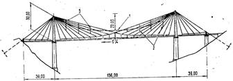 1 – ванты, 2 – балка жесткости, 3 – пилоны. 4 – проезжая часть, 5 – продольные связи между балками