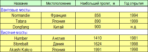 В настоящее время в мире существует не менее18мостов с основным пролетом длиной более 1 км. В табл. 3.2, представлены данные из опыта мостостроения, проиллюстрированы возможности перекрытия пролетов разной длины конструкциями висячей и вантовой системы (более подробное описание некоторых сооружений содержится в приложении).