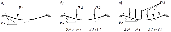 1. Загружение кабеля сосредоточенной силой и загружение равномерно распределенной по длине нагрузкой, дает в результате различные формы равновесия висячей системы (см. рис. 8.2).