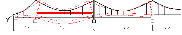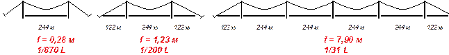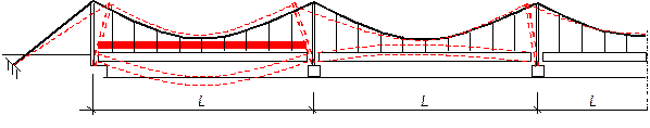 Данное исследование позволяет сделать вывод, что применение многопролетных висячих мостов без принятия специальных мер повышающих их жесткость практически невозможно.