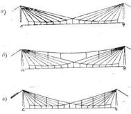 – введение в состав фермы вертикальных подвесок (рис. 9.10 в) разделяющих длинные ванты на ряд относительно коротких участков. Эти подвески включаются в работу фермы только под вертикальной нагрузкой.