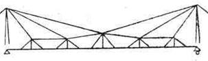 В этой статически определимой системе еще далее, чем в предыдущей, развита идея уменьшения числа радиальных вант, при сохранении величины панели проезжей части. Ферма изображенная на рис. 9.13 имеет всего шесть радиальных вант вместо 15, которые необходимы в простой радиально-вантовой ферме при том же числе панелей проезжей части.