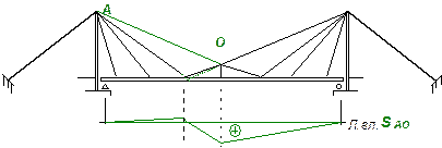 От обычной лучевой фермы рассматриваемая ферма отличается тем, что в целях создания необходимого запаса по растяжению в верхних вантах, средний узел фермы с приподнят над уровнем поясной балки. Этим достигнута возможность ввести в состав фермы, в двух средних панелях, наклонных поясных вант, образующих малый угол с направлением верхних вант (рис. 9.17 а). При этом, однако, ферма становится однажды статически неопределимой.