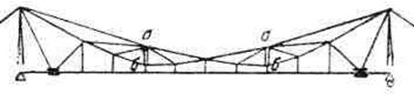 Схема предложена инженером В.А. Росновским. Основная идея вантовой фермы – получение коротких вант и несложных узлов, особенность – наличие двух жестких элементов «аб», работающих кроме растяжения, также и на сжатие.