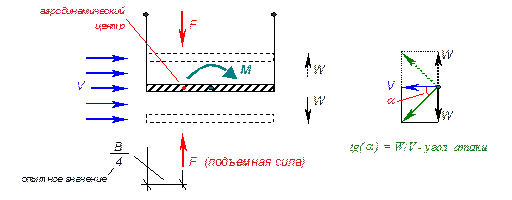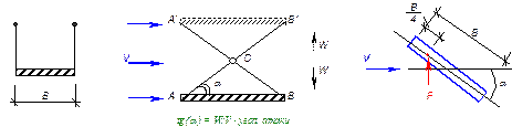 При этом появляется и непрерывно меняется угол атаки (a) воздушного потока набегающего на проезжую часть (восходящему потоку соответствует +a, нисходящему -a), ввиду чего на сооружение начинает действовать подъемная сила создающая крутящий момент (М=F´В/4).