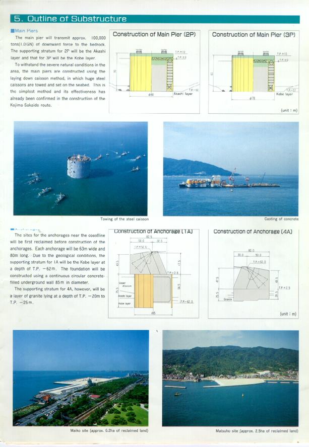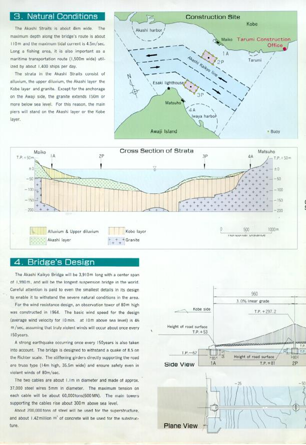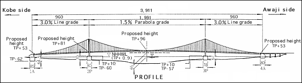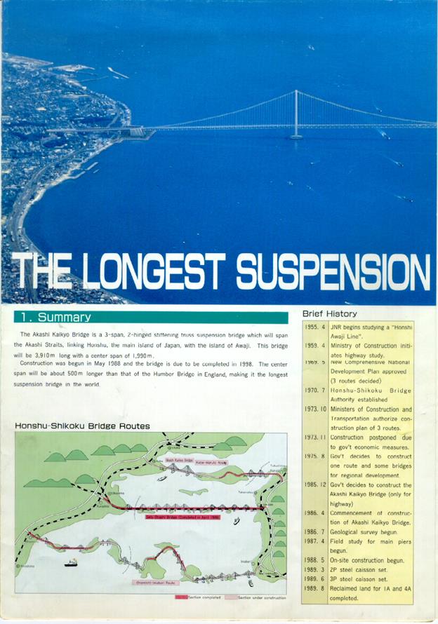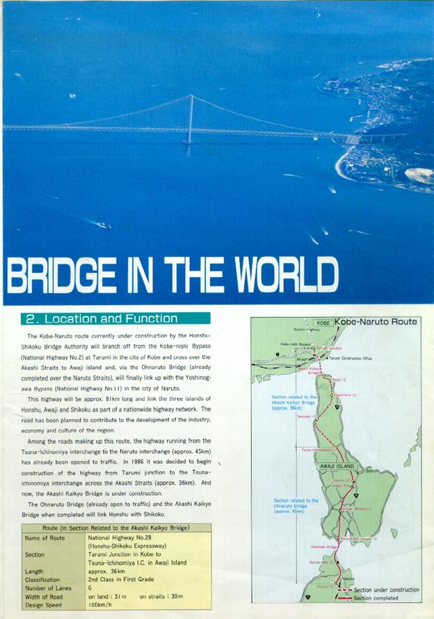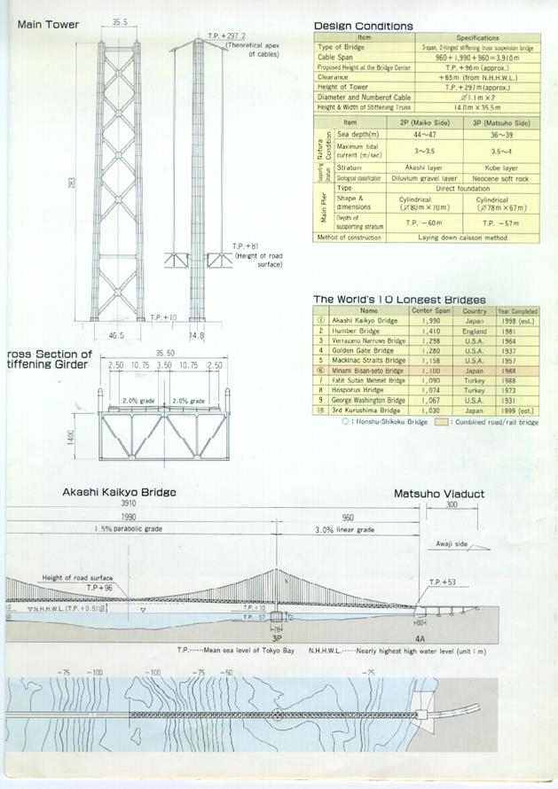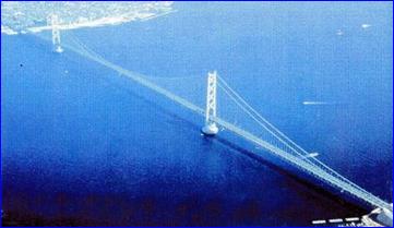 Расположенный вблизи города Кобе мост представляет собой важнейшее звено авто- и железнодорожной транспортной системы, соединяющей острова Хонсю и Сикоку. Центральный пролет висячего трехпролетного моста равен 1990,8 м, (в настоящее время является мировым рекордом), пилоны высотой 297 м и решетчатая балка жесткости выполнены из стали. Мост введен в эксплуатацию в 1998 г (см. рис. 1 и 2).