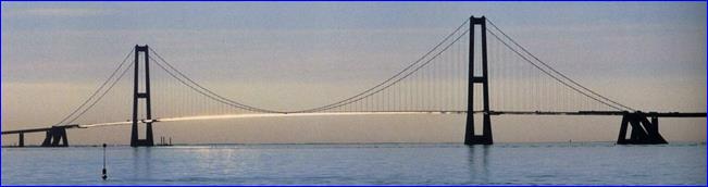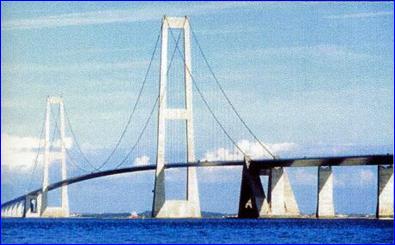 Висячий мост (рис. 1) является частью транспортной системы длиной 18 км, соединяющей два датских острова Зеландию и Фюн. Рекордный для своего времени (мост построен в 1997 (1999) г.) центральный пролет длиной 1624 м потребовался для того, чтобы избежать непредсказуемых последствий от возможной аварии сооружения при навале судов на опоры моста, поскольку интенсивность судового крупнотоннажного движения по проливу одна их самых высоких в мире. Кроме того, столь большой пролет позволял минимизировать влияние сооружения на характер протекания водного потока между Балтийским и Северным морями. Вершины пилонов высотой 254 м являются самыми высокими точками на территории Дании.