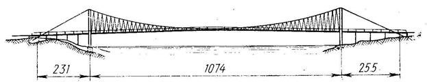 В 1973 г. в Стамбуле (Турция) было закончено строительство первого моста соединяющего Европу и Азию через пролив Босфор (рис. 1.). Главный пролет висячего моста равен 1074 м. Высота подмостового габарита в 64 м, что обеспечивает проход самых больших судов, курсирующих в Средиземном и Черном море. Босфорский мост вместе с системой дорог обеспечивает регулярную связь между двумя частями Турции, разъединенными Дарданеллами, Мраморным морем и Босфором.