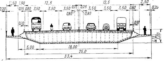 Общая схема Босфорского моста изображена на рис. 2, здесь, так же как в Северенском мосту, применены наклонные подвески, что увеличило общую жёсткость пролетного строения. Конструкция коробчатой балки жесткости показана на рис. 3.