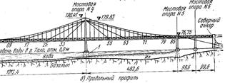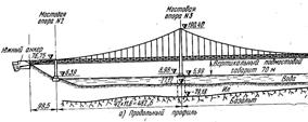 На рис. 3 показана общая схема мостового перехода. На левой части рисунка (рис. 3, а) изображена схема моста, по которому открыто автомобильное движение. На правой части (рис. 3, б) показана схема моста после завершения второй очереди строительства. На этом рисунке видны ванты и дополнительный кабель, которые увеличат грузоподъемность моста и тем самым обеспечат пропуск железнодорожного транспорта по нижнему ярусу. Дополнительный кабель запроектирован из 20 канатов диаметром 75 мм, предварительно свиваемых из стальной проволоки. Короткие ванты состоят из 8 предварительно свитых стальных канатов, каждый диаметром 67 мм. Длинные ванты состоят из 12 канатов того же диаметра.