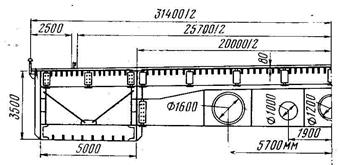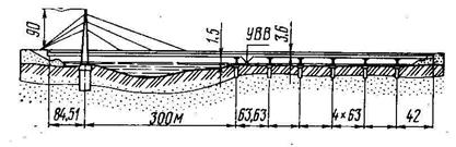 Мост расположен на вертикальной кривой радиусом 15 000 м, при возвышении низа конструкции над расчетным судоходным уровнем – 16 м. А-образный железобетонный пилон имеет высоту 90 м и в пределах выше балки жесткости пустотелый с толщиной стенок 75 см. Металлическая балка жесткости – постоянной высоты 3,5 м из стали 10ХСНД – имеет три подвижные металлические опорные части и защемлена концом в устое. Состоит из двух коробок 5,0´3,5 м и соединяющих их поперечных балок (см. рис. 2). Проезжая часть ортотропной конструкции с болтофрикционными соединениями элементов.