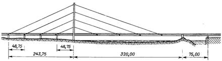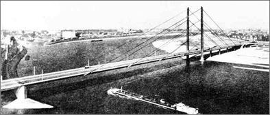 Мост Книбрюкке построен в Дюссельдорфе через р. Рейн. Основной пролет моста величиной 320 м, перекрыт вантовой системой «арфа» с двухстоечным раздельным пилоном.