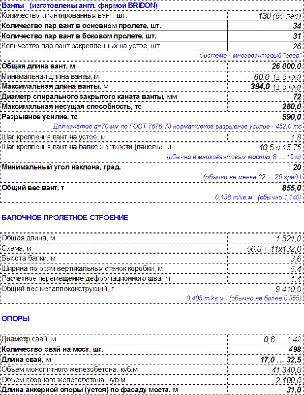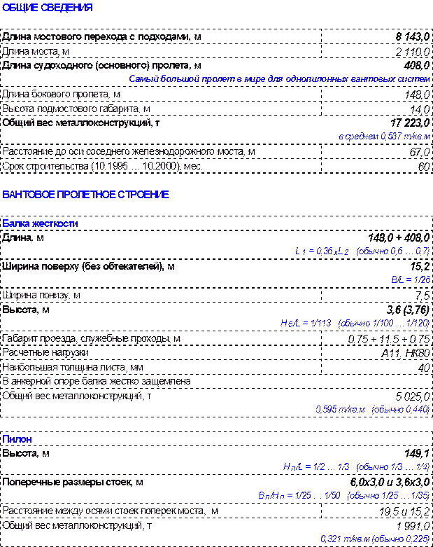 Характерной особенностью сооружения явилось инженерное решение конструкции балки жесткости. Ее припилонные участки сооружены из предварительно напряженного железобетона, а центральная часть пролета выполнена из стали. Подходные эстакады (пролётами по 43,5 м, северная длиной 650 м, южная – 460 м) из предварительно напряжённого железобетона, ощутимо повысили стоимость строительства, однако позволили использовать их в качестве анкерных блоков и повысить аэродинамическую устойчивость сооружения. Число вант поддерживающих балку жесткости 184, длинна от 95 до 450 м. Ширина балки жёсткости 23 м, с высотой проезда над водой – 56 м. Проезжая часть моста с одного берега до другого не имеет деформационных швов.