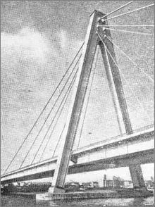 Единственный металлический пилон этого моста с радиально расположенными вантами изображен на рис. 2. Ширина проезжей части для четырехполосного автомобильного транспорта и двух трамвайных путей равна 19 м. Вместе с тротуарами по 5,25 м общая ширина между перилами составляет 29,5 м. Ванты выполнены из пучков канатов с временным сопротивлением проволоки 14000 кг/см2. Расстояние между осями двух главных балок 22,3 м. Коробчатое сечение этих балок принято с учетом размещения коммуникаций. Ноги пилона имеют вид коробчатой стальной конструкции с толщиной стенок от 12 до 30 мм. Высота над высшим навигационным уровнем 9,1 м. Подходы к мосту выполнены в нескольких уровнях.